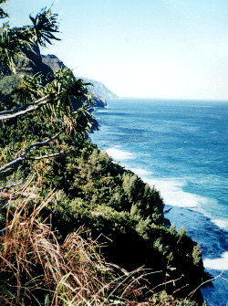 The north shore of Kauai is dominated by the steep Na Pali cliffs. The cliffs provide a rugged grandeur of deep, narrow valleys ending abruptly at the sea. Waterfalls and swift running streams continue to cut into these narrow valleys while the sea carves cliffs at their mouths. We hiked a part of the Kalalau trail from Kee Beach to Hanakapiai Beach. This is about a 4 mile round trip and offers spectacular views. The trail can be steep, wet, muddy, and slippery, and it was all of these on the day we hiked. The weather was beautiful, however, and it was a fine hike.