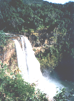 Wailua falls on the Wailua River is easily accessed by paved road from Lihue and is certainly worth the trip. The 80 foot falls were shown during the opening credits of the television show "Fantasy Island". In ancient times, Hawaiian chiefs would dive over the cliff into the pool to prove their courage. Only persons of royal blood were considered sufficiently courageous and powerful to perform this feat. Since I am not of royal blood, I didn't try the dive.
